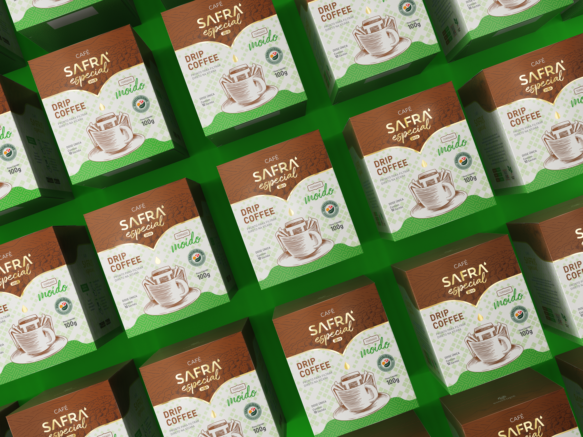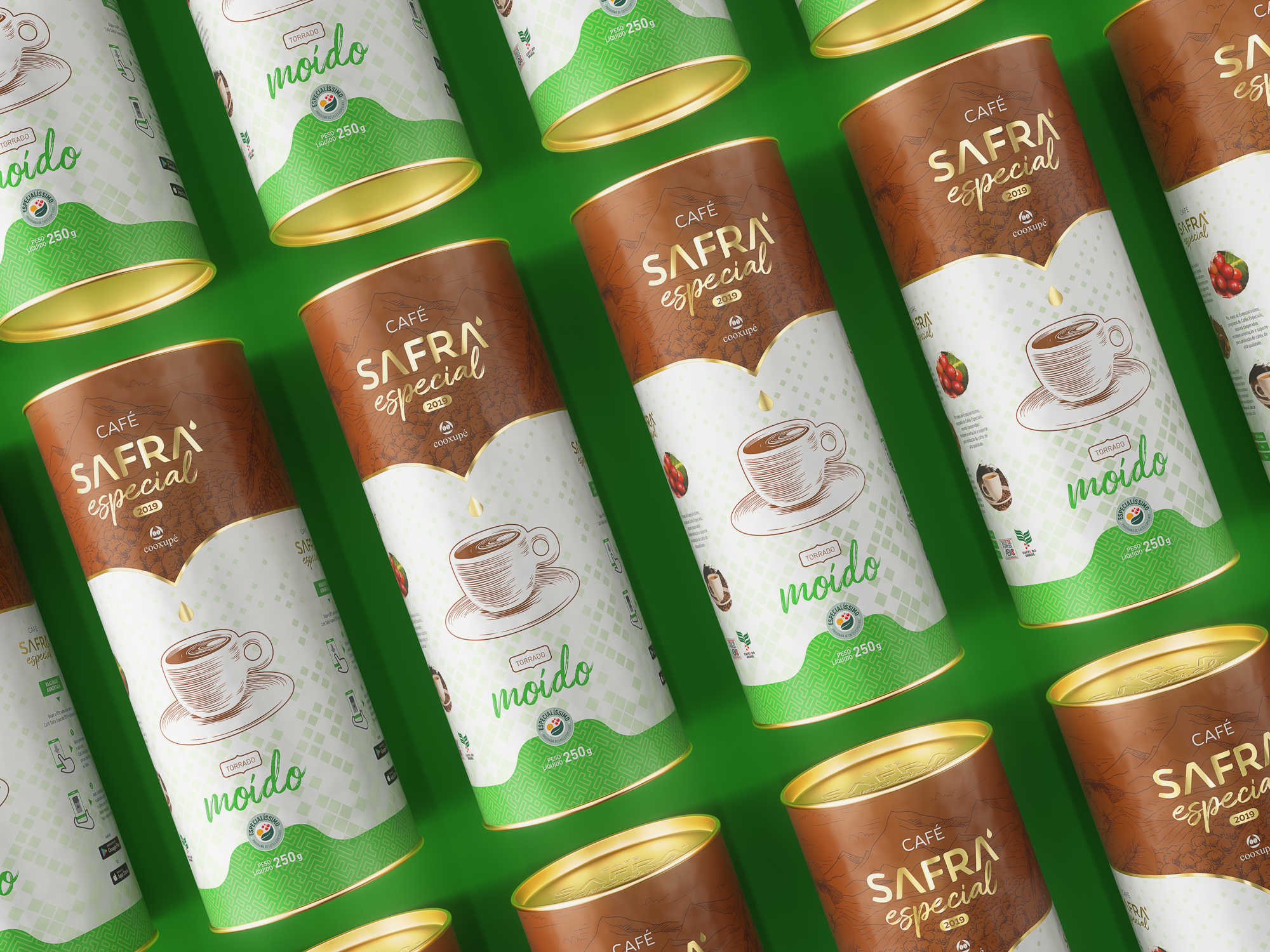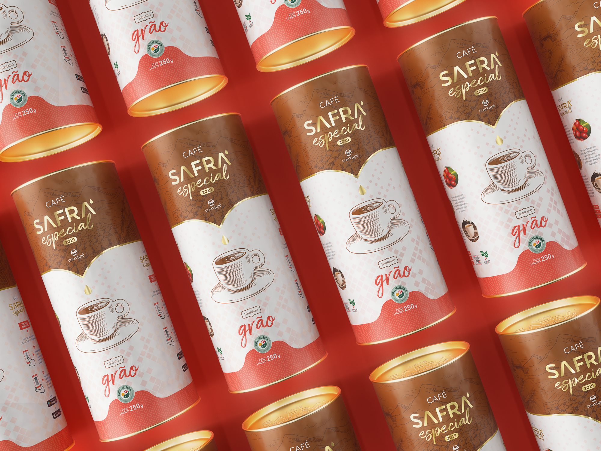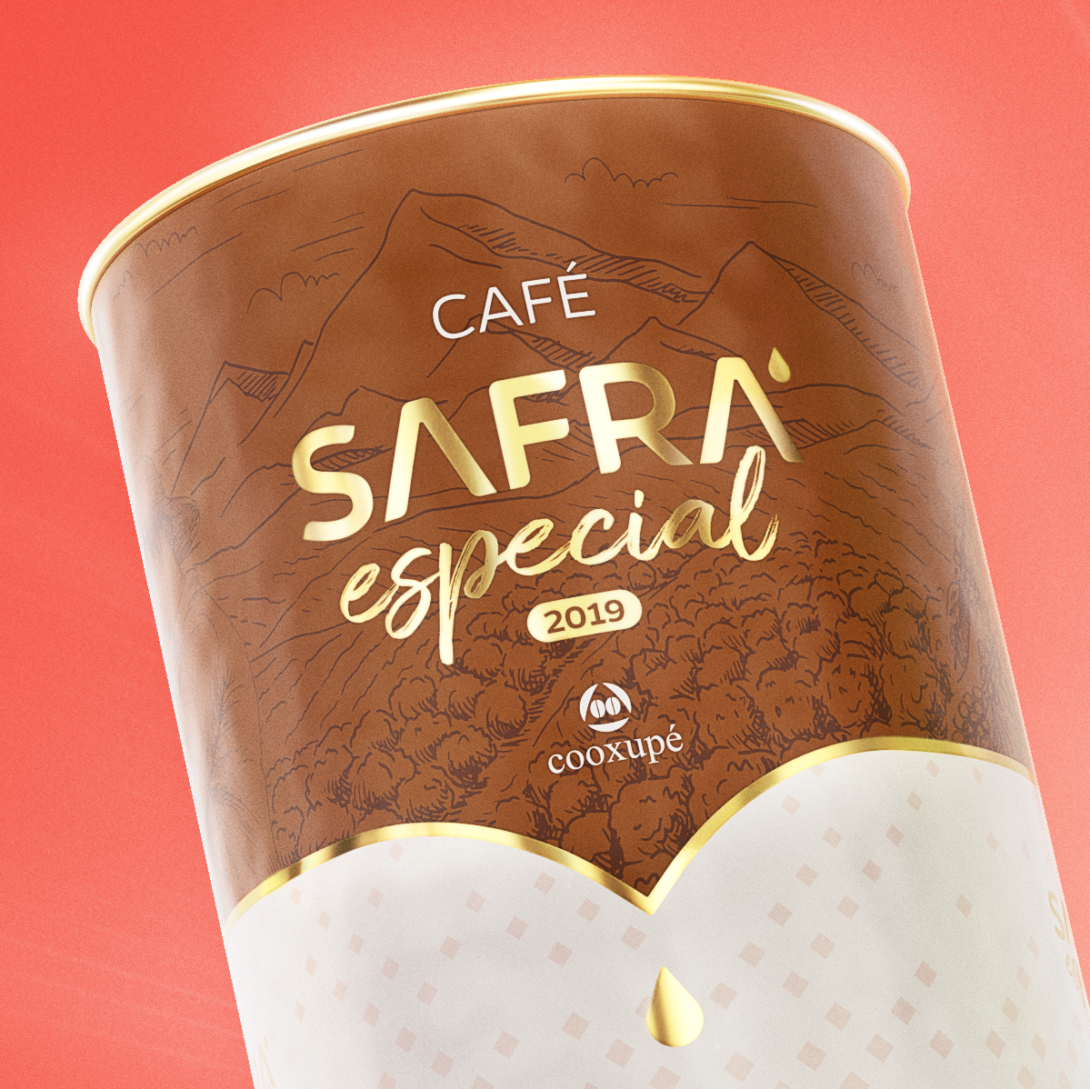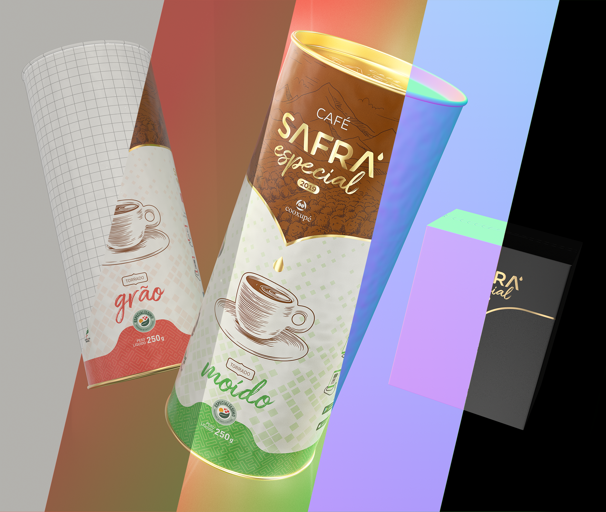 O Café Safra Especial 2019 marcou um momento importante na trajetória do estúdio — o primeiro projeto de mockups 3D desenvolvido para os Cafés Cooxupé.