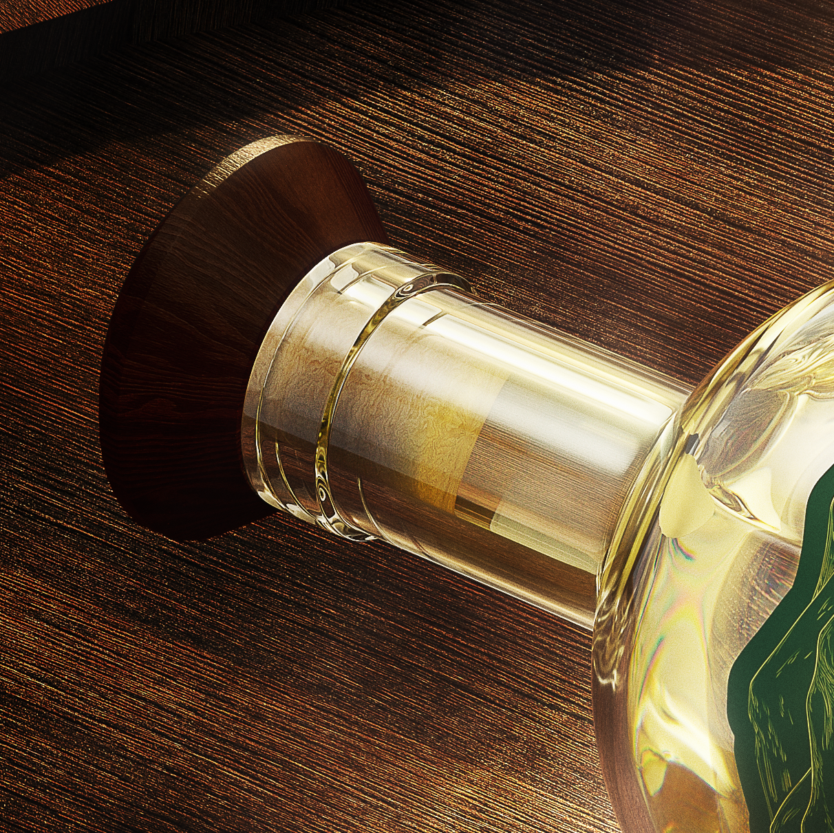 A iluminação pontual valoriza o brilho do líquido e as nuances do vidro, criando um contraste elegante entre sombra e destaque. Cada detalhe foi cuidadosamente trabalhado para transmitir o conceito de um produto artesanal que repousa e evolui, ganhando notas únicas com o passar dos anos.