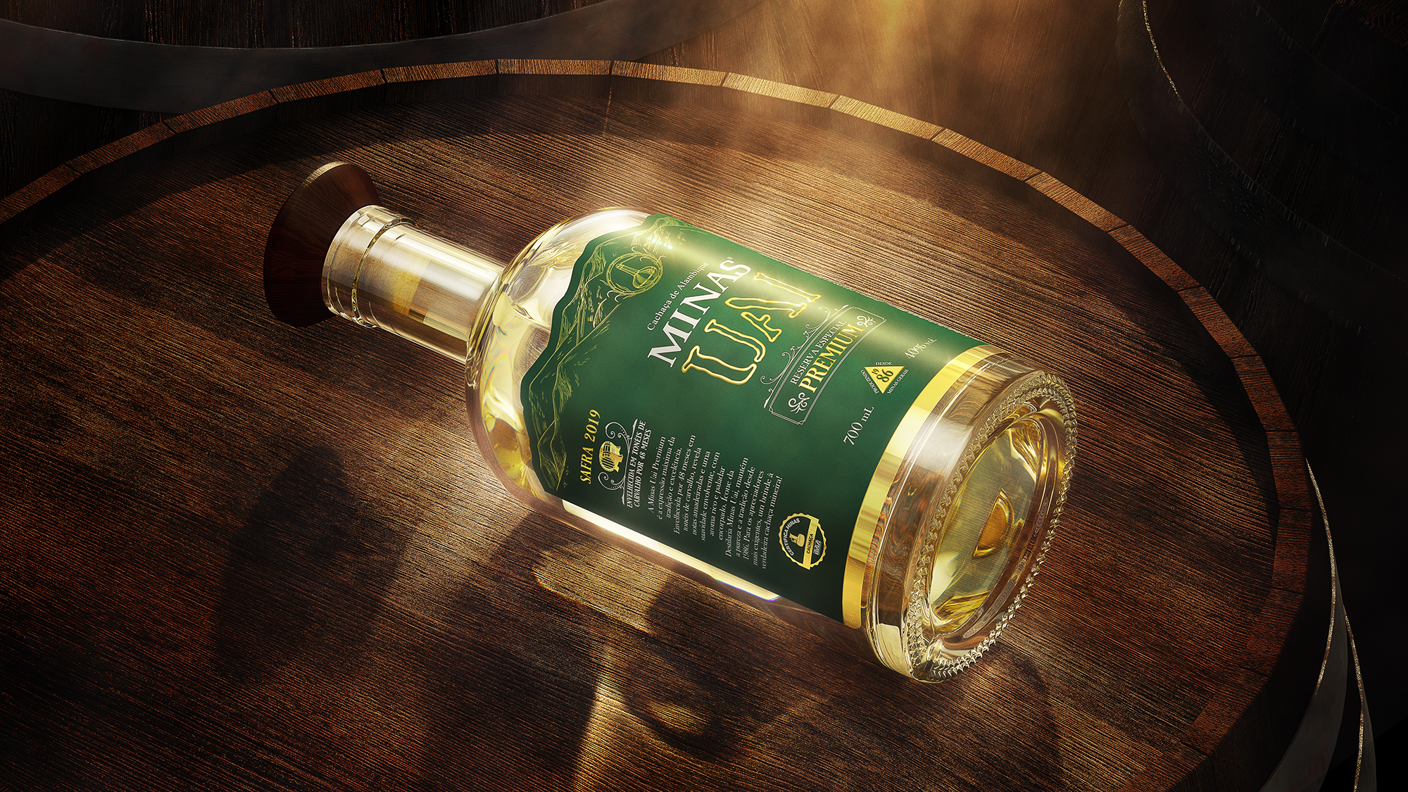 Para a Cachaça Minas Uai Premium, a proposta foi criar uma imagem 3D que expressasse tradição, maturidade e o valor do tempo.