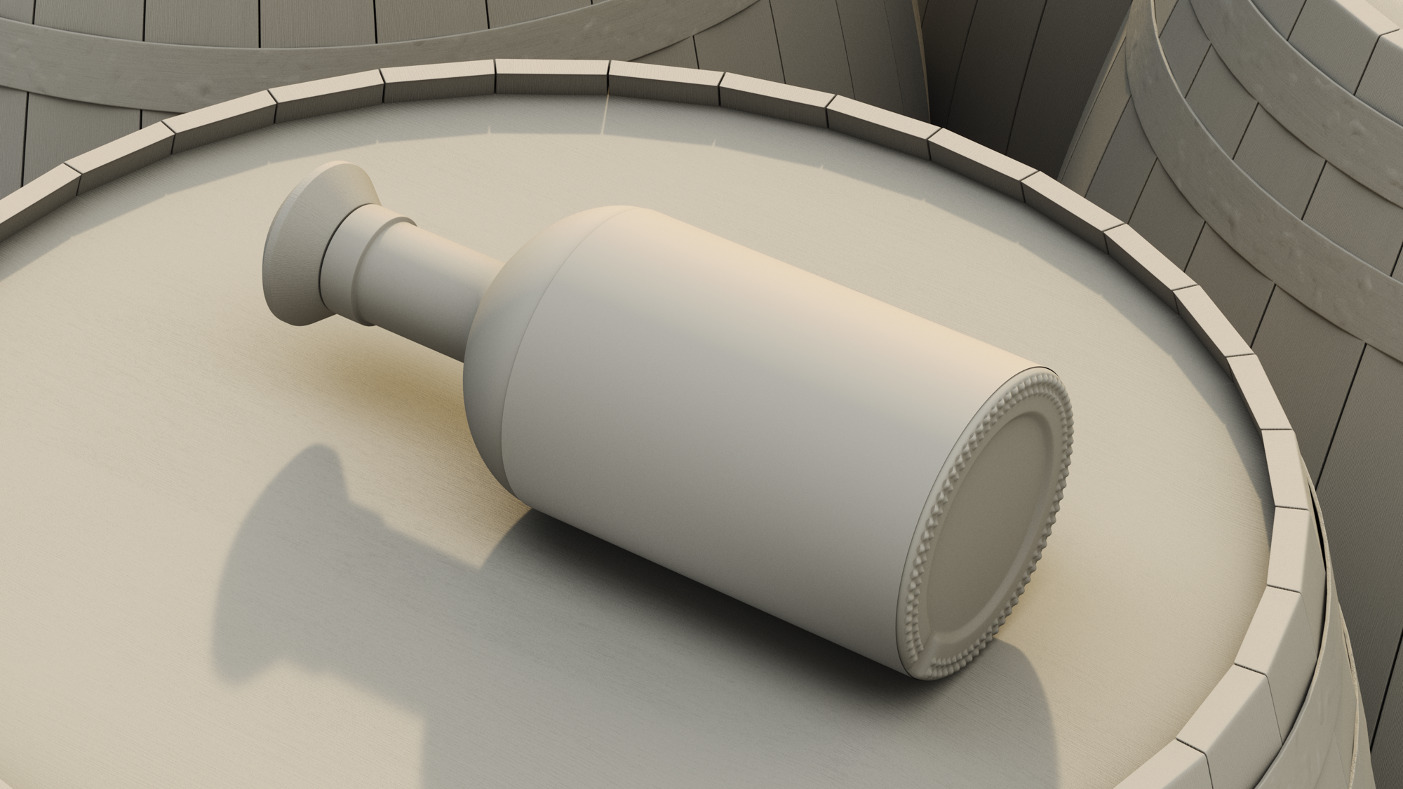No interior da garrafa, os grãos foram simulados por meio de um sistema de partículas, resultando em uma distribuição orgânica e realista que reforça o cuidado e o alto padrão visual da linha Prima Qualità.